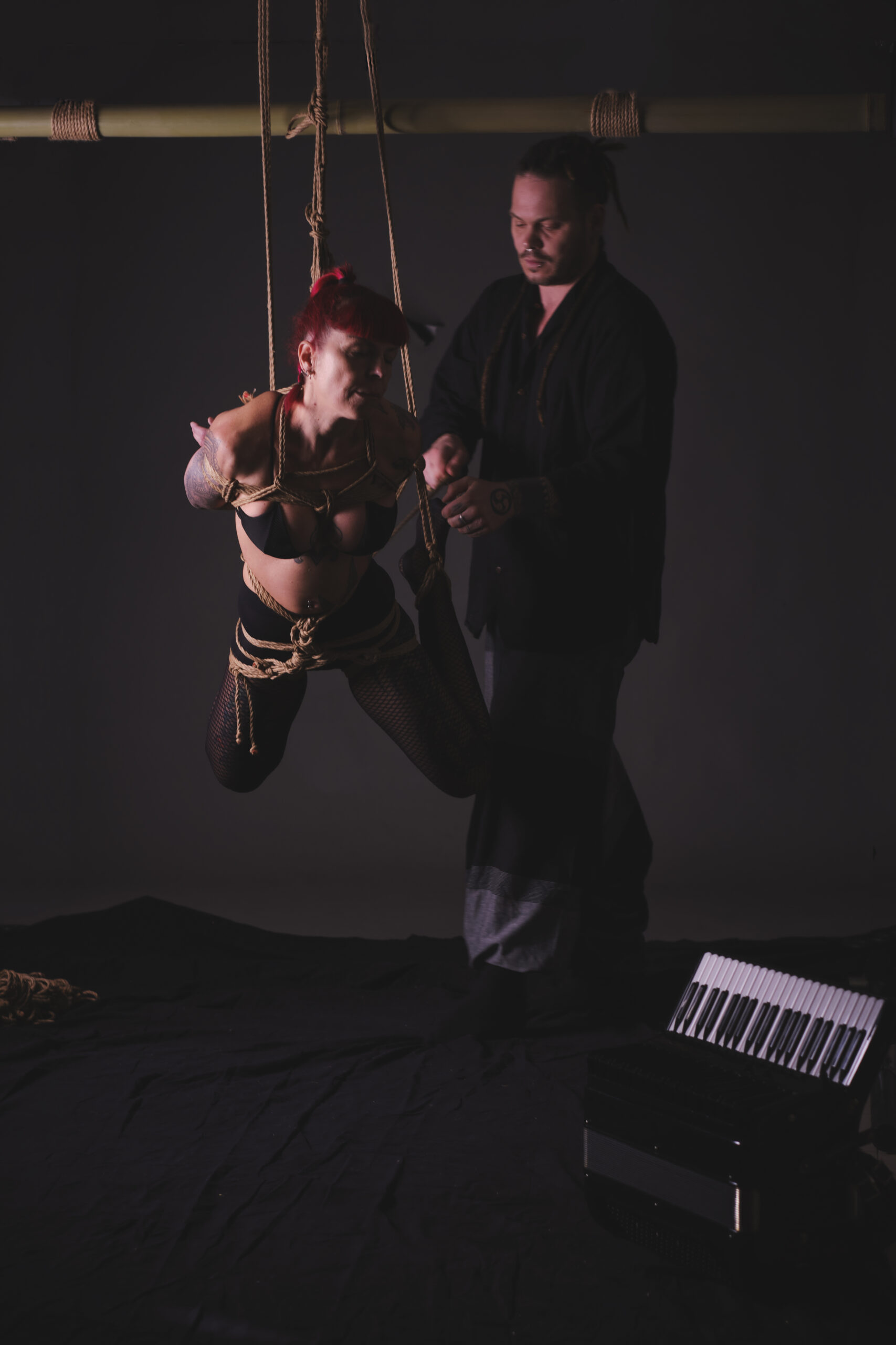 In parallel, he pursued research into the Japanese art of Kinbaku at the Kinbaku Academy in Tokyo under Master Osada Steve. This research gave rise to BizzAccord, a surreal space where music, body, and images interact.